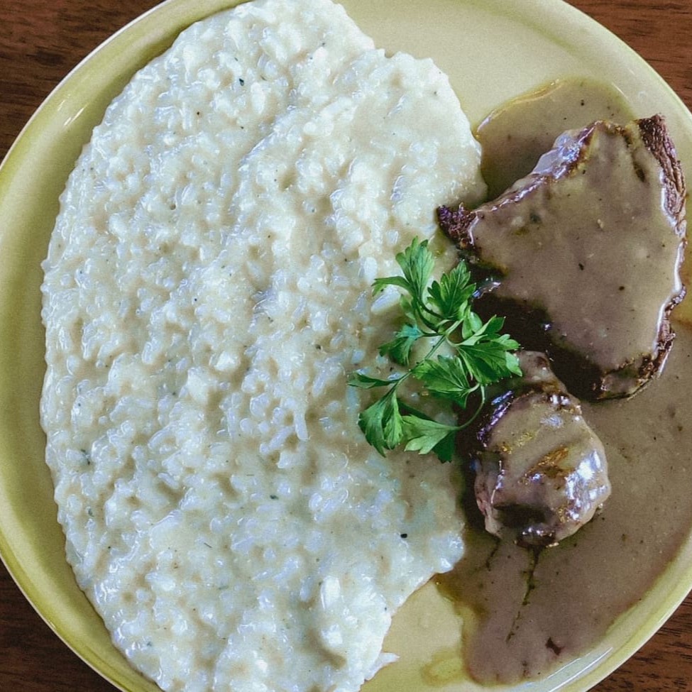 Delicioso risoto preparado com gorgonzola no arroz arbório, manteiga da fazenda e vinho branco, acompanhado de escalope de filé mignon macio e suculento, finalizado com molho madeira e salsinha.