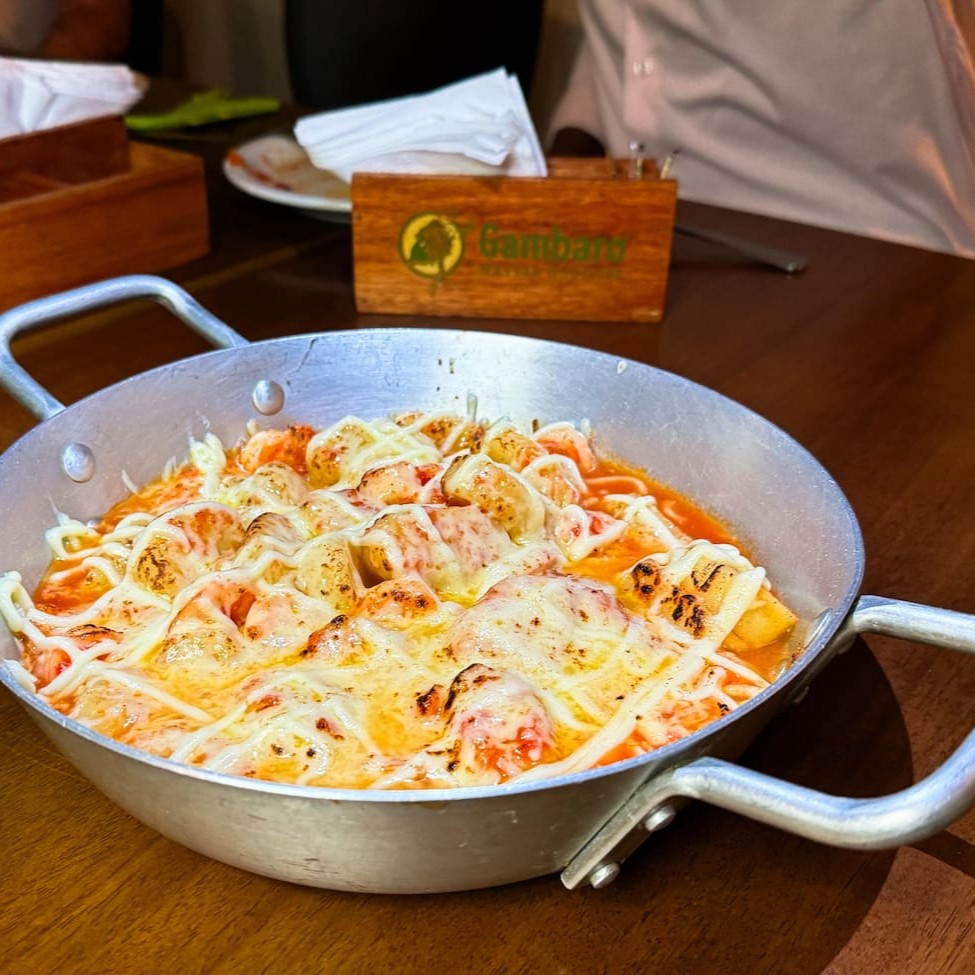 O Gnocchi Al Mozzarella p/2, estrela do nosso Festival dos Nhoques Artesanais, apresenta um equilíbrio perfeito de sabores. Este prato é harmonizado com primor, combinando o clássico nhoque al sugo, confeccionado com a autêntica receita italiana, com a suculência irresistível do camarão fresco. A finalização da receita é realizada com uma generosa camada de muçarela e Catupiry. Juntos, esses ingredientes são gratinados à perfeição, resultando em uma casquinha crocante por fora e um interior cremoso e saboroso. Uma verdadeira delícia que proporciona uma experiência gastronômica única.