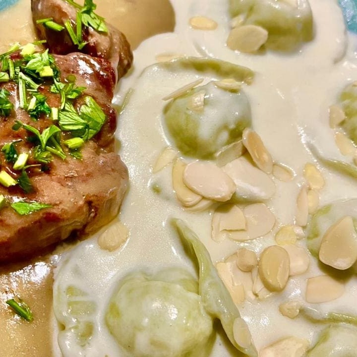 Delicie-se com esta harmonia de sabores refinados: massa artesanal de ravioli verde de rúcula, recheada com uma mistura cremosa de queijps, acompanhada de suaves escalopes de filé mignon - grelhados no ponto perfeito, com um exterior dourado e interior rosado. Uma experiência gastronômica que une a tradição italiana à nobreza dos cortes premium!