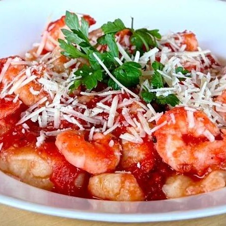 Deliciosa e macia massa de batata, servido com camarões suculentos e molhos artesanais. Escolha seu molho favorito.