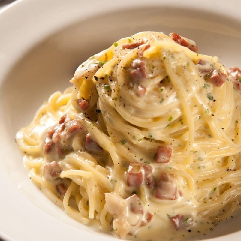 Apresentamos o nosso Carbonara, um dos pratos mais queridos da casa! Este clássico italiano é preparado com ovos frescos e bacon crocante, servido com a massa de sua preferência. Importante ressaltar que nossa receita é autêntica e não contém creme de leite ou molho branco. Uma experiência culinária que promete encantar seu paladar!