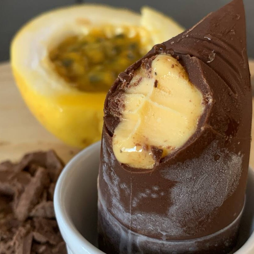 Um verdadeiro mousse de maracujá, coberto por umas casquinha de chocolate nobre blend, uma perfeição!