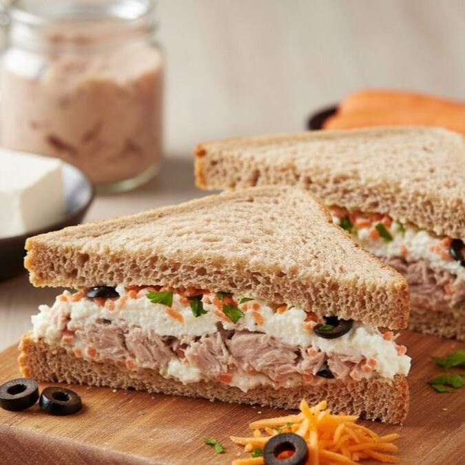 Delicioso Sanduíche natural de atum, ricota, cenoura e azeite.