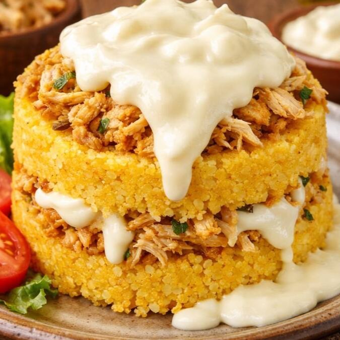 Cuscuz de milho preparado no vapor, macio e saboroso, recheado com frango desfiado bem temperado e finalizado com requeijão cremoso, garantindo suculência e equilíbrio de sabores. Um prato caseiro, reconfortante e perfeito para qualquer refeição.