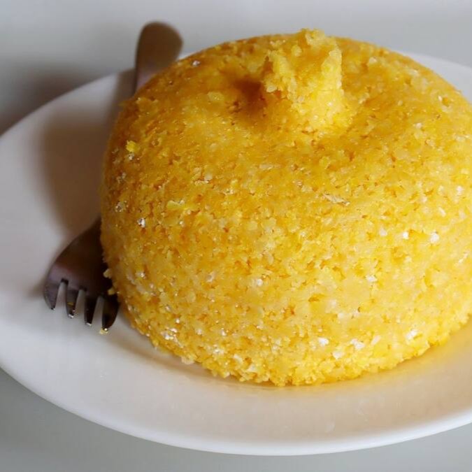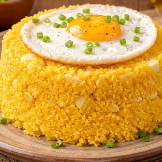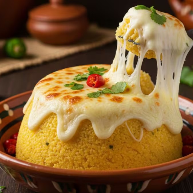 Cuscuz de milho preparado no vapor, de textura macia e sabor delicado, recheado com queijo derretido que confere cremosidade e equilíbrio ao prato. Uma preparação simples e autêntica, que valoriza ingredientes tradicionais da culinária brasileira, destacando aromas, textura e conforto gastronômico.