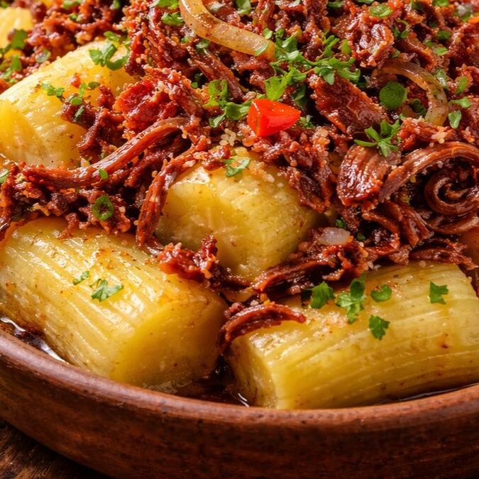 Aipim macio e bem cozido, servido em pedaços generosos, coberto com carne de charque desfiada e suculenta.Um prato rústico, cheio de sabor e perfeito para matar a fome com comida de verdade!