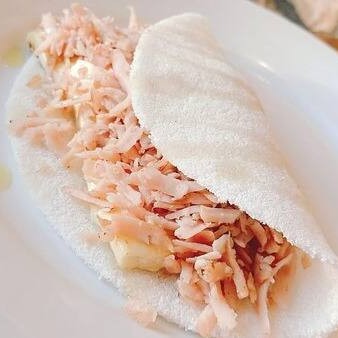 A escolha perfeita para quem busca um lanche leve e nutritivo! Nossa tapioca é feita com goma hidratada de alta qualidade, recheada com fatias selecionadas de peito de peru defumado.