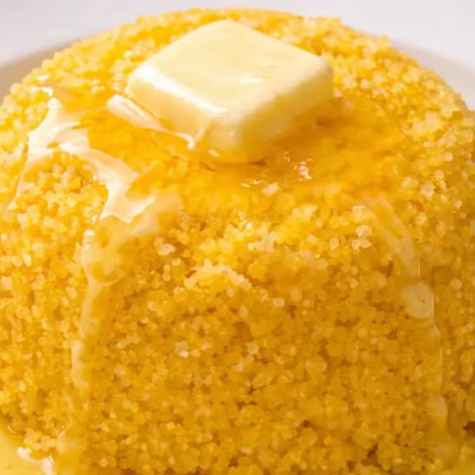 O clássico douradinho que todo mundo ama! Nosso cuscuz é hidratado com carinho, cozido no vapor até ficar super fofinho e finalizado com uma generosa camada de manteiga que derrete e penetra na massa. Quentinho, úmido e com aquele aroma irresistível que invade a casa. Simplesmente perfeito!
