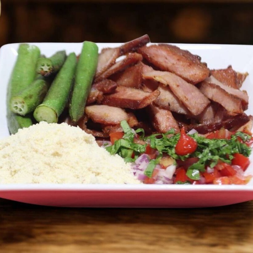 Filé especial de porco defumado, grelhado e fatiado com perfeição. Podendo adicionar quiabo no vapor, salada vinagrete fresca e farofa dourada na manteiga de garrafa e muito mais.