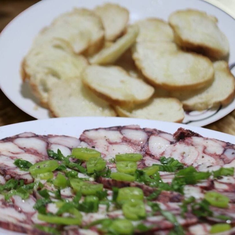 Polvo cozido e refogado, regado com azeite extra virgem, salada a vinagrete com lâminas de rúcula e acompanhado de fatias de torradas.