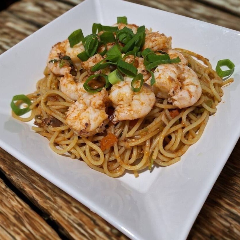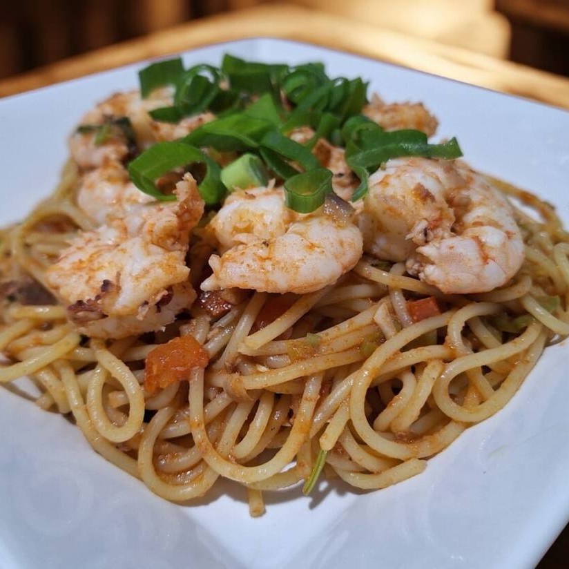 Spaghetti ao molho de tomate caseiro e camarão preparado com ervas frescas, uma combinação que exalta o sabor do mar em cada detalhe.