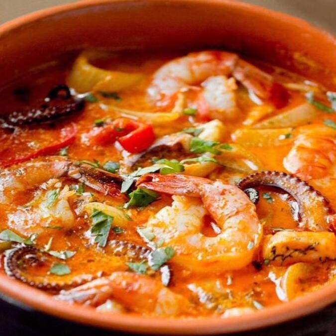 Misto de frutos do mar preparado com cheiro-verde fresco, alho e cebola refogados, tomate maduro e pimenta-do-reino, combinando camarão seco, camarão fresco e polvo. Finalizado com azeite de oliva, aipim macio e batatas, resultando em um prato aromático, equilibrado e de sabor marcante. Acompanha 3 fatias de torras e metade de 1 limão cortado.