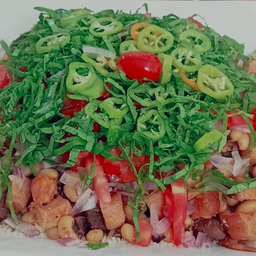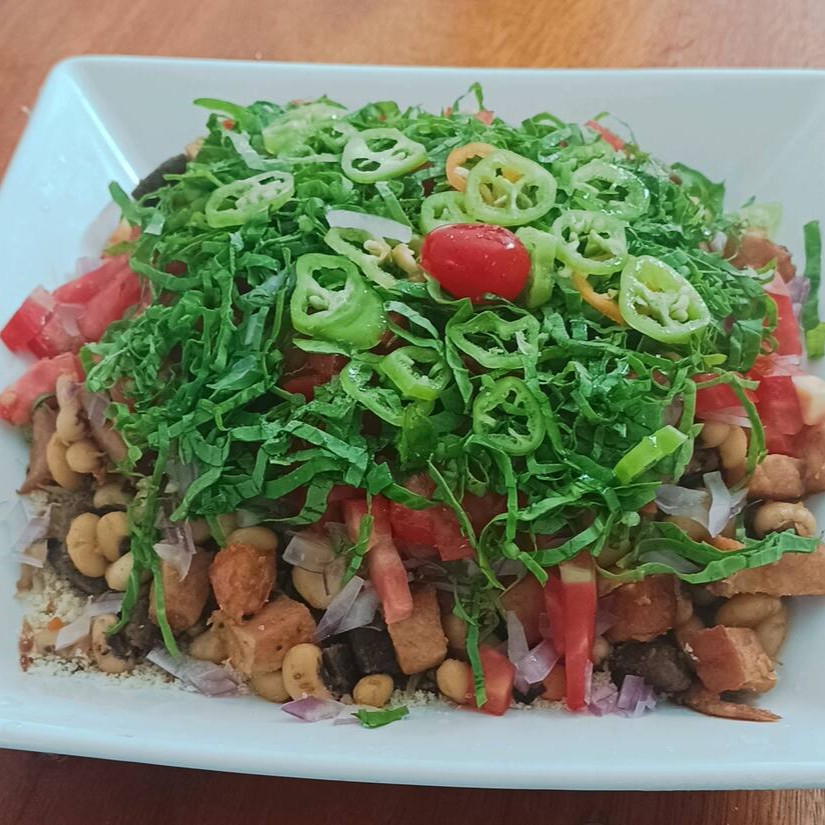 Carne de fumeiro, carne de sol grelhada e chouriço frito, acompanhados de feijão-fradinho temperado, salada vinagrete fresca e farofa dourada na manteiga, uma composição autêntica que celebra a riqueza e o sabor marcante da culinária nordestina.