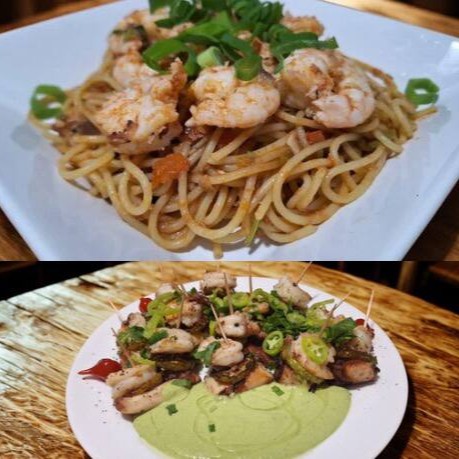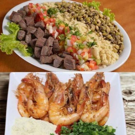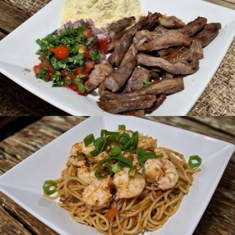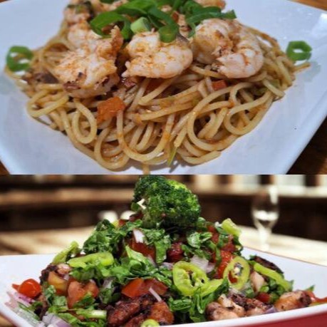 Combo acompanha: Spaghetti ao molho de tomate e camarão, ervas cozidas e camarões. + Polvo cozido e refogado, regado com azeite extra virgem, salada a vinagrete com lâminas de rúcula e acompanhado de fatias de torradas.