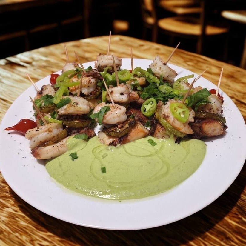 Deliciosos espetinhos combinando filé de camarão pistola, maxixe em rodelas e tentáculos de polvo, acompanhados por 6 torradas douradas e um delicado molho de ervas frescas.