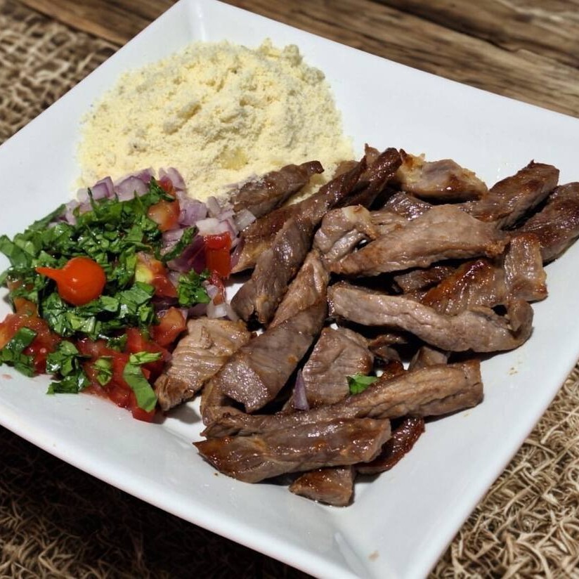 Carne do sol fatiada e grelhada na chapa, acompanhada de vinagrete e farofa de manteiga na garrafa.