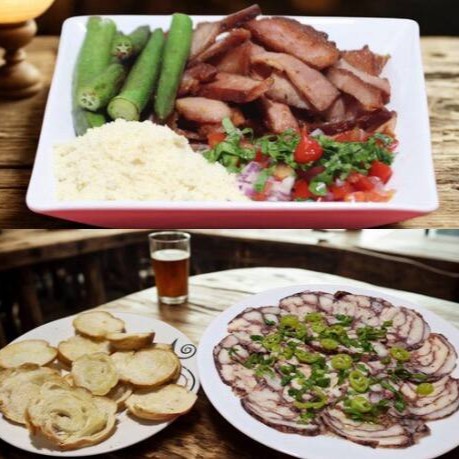 Filé especial de porco defumado, grelhado e fatiado, acompanhado de quiabos, vinagrete e farofa de manteiga na garrafa. + Lâminas de salame de polvo, temperadas com ervas, azeite extra virgem e limão, acompanhadas de 15 torradas e molho de ervas.