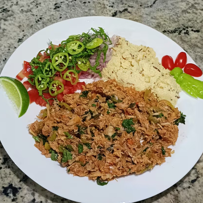 Siri catado, servido com salada vinagrete fresca e farofa dourada caseira na manteiga de garrafa leve, cheirosa e cheia de sabor.