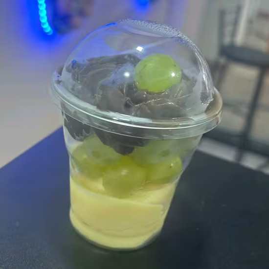 Chocolate 50% cacau, uva fresca no meio e um creme de leite em pó.