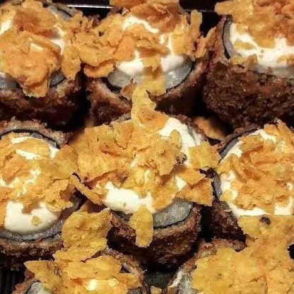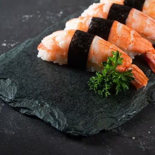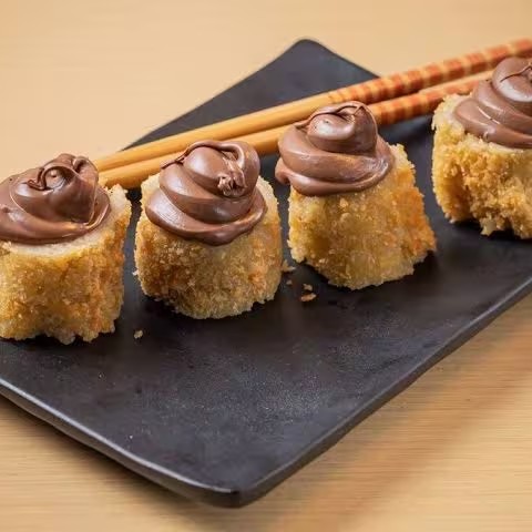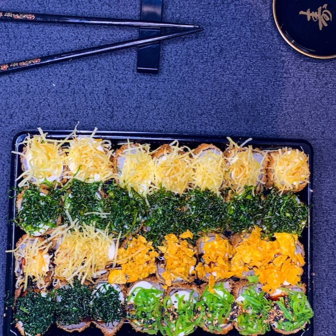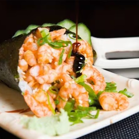Salmão e Camarão cortado em cubos com uma leve pitada cebolinha envolto na alga com arroz e creme chesse