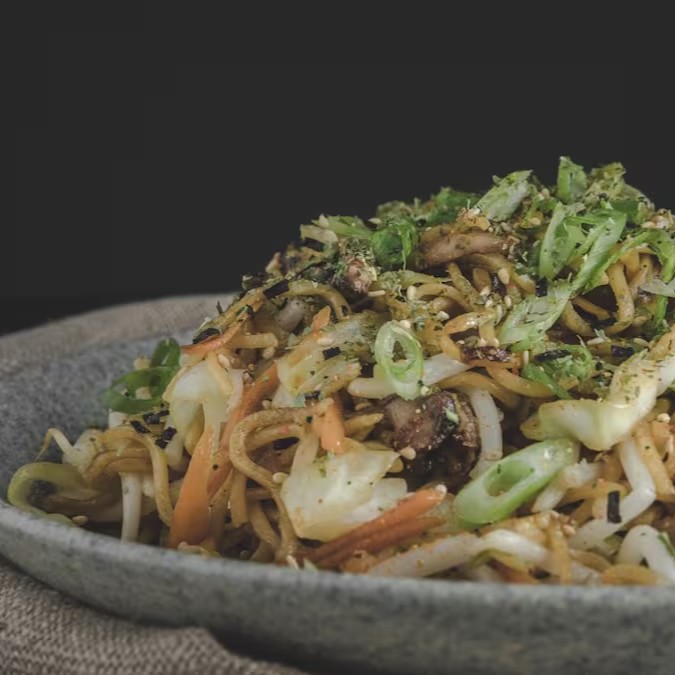 Salmão cortado em cubos envolto na alga com arroz e cebolinha