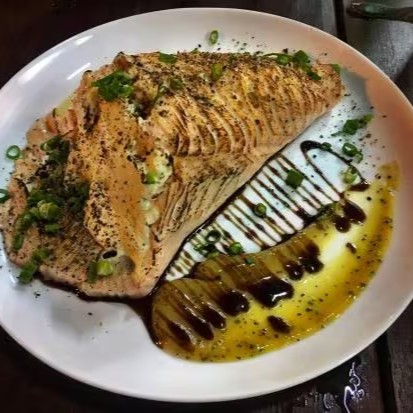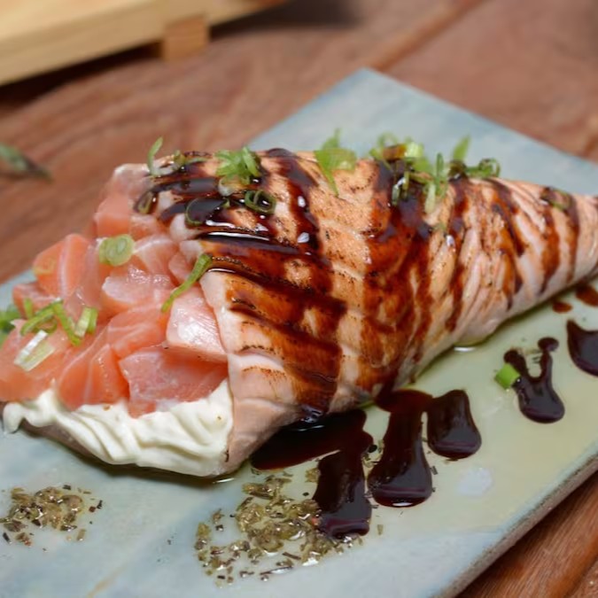 300g lamina de salmao flambada, com recheio de salmão grelhado