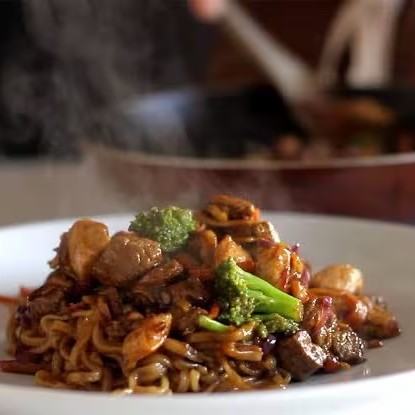 Lâmina de Salmão envolto no camarão com creme chesse, levemente flambado com um toque de molho especial do chef