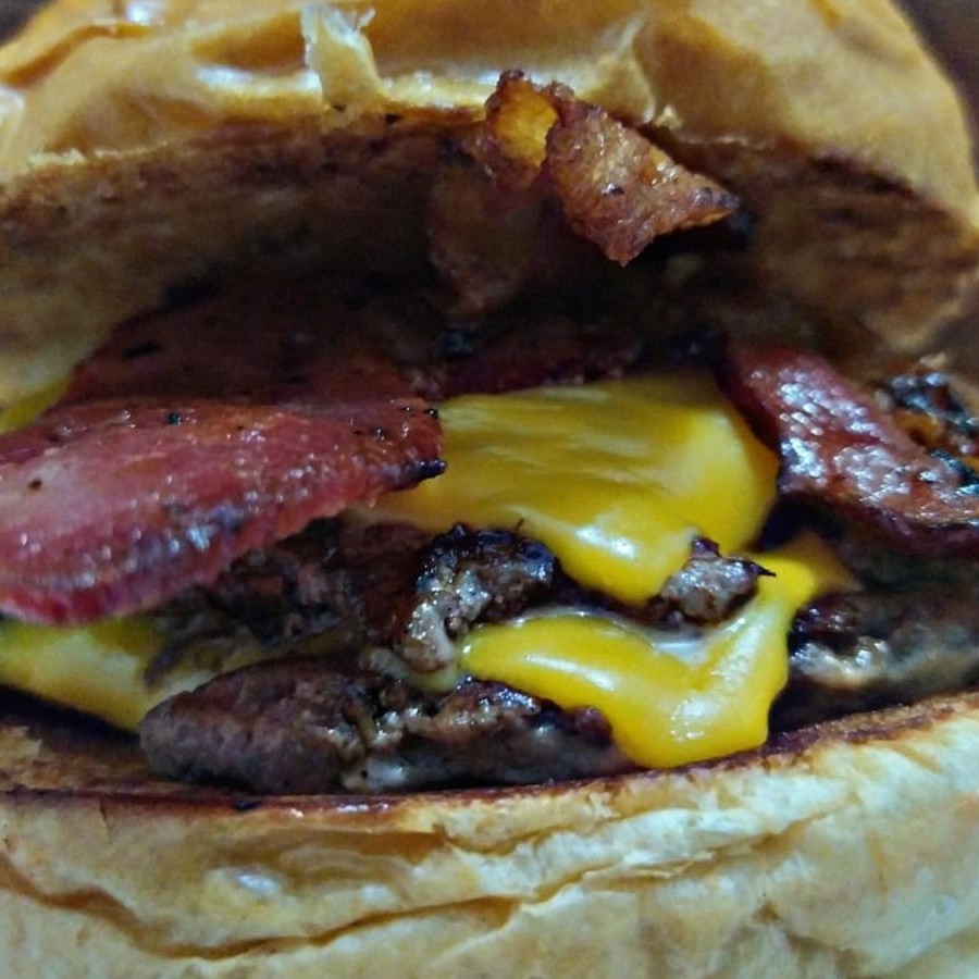 Soldado: 2 carnes de 100 g , com um melt de cheddar especial da casa e farofa de bacon no pão australiano.