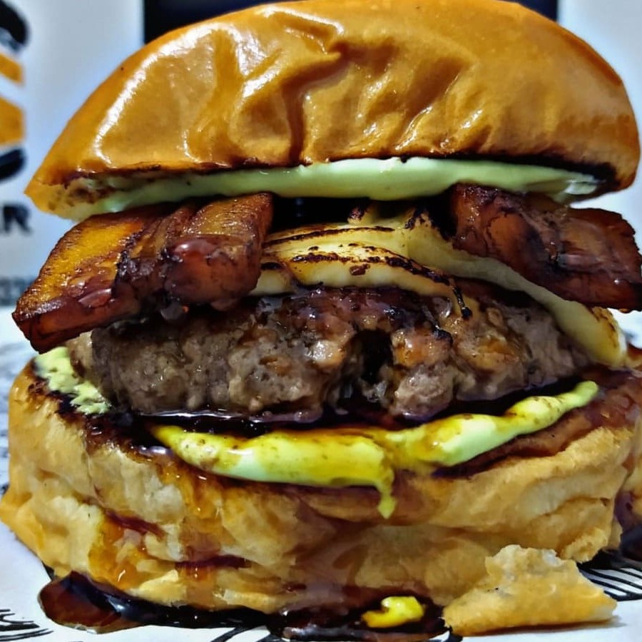 Coronel: Burguer de 140g, queijo coalho Maçaricado, banana da terra , maionese de ervas , melaço de cana, servidos no pão brioche.