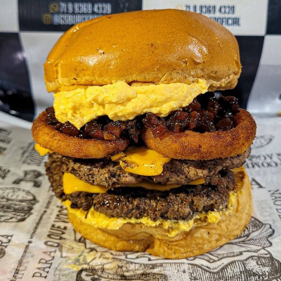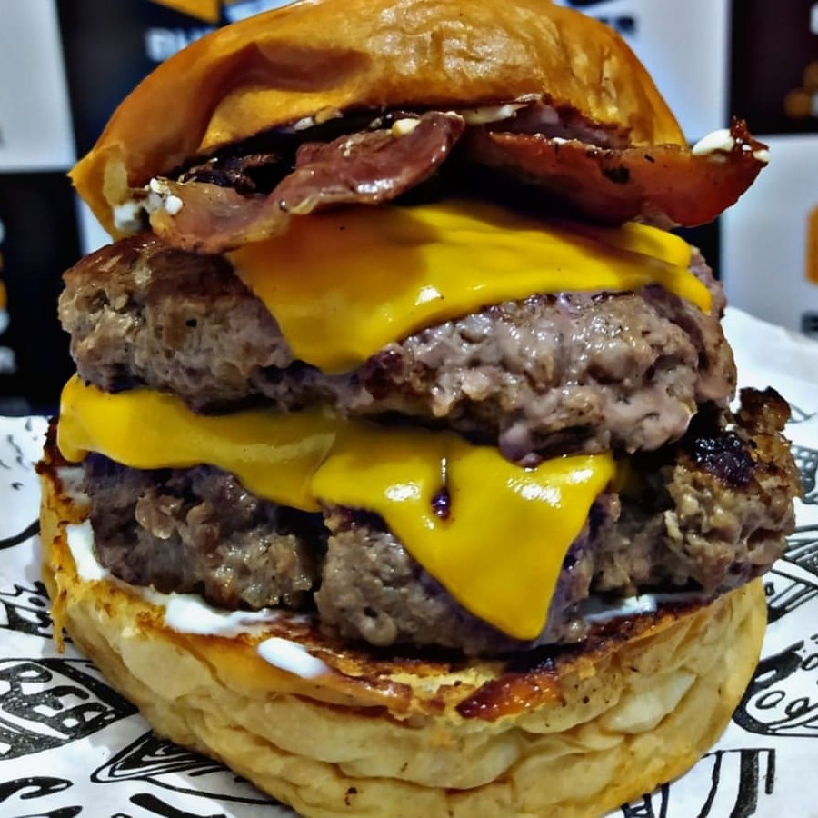 2 Carnes de 100g, molho Aiolo, queijo cheddar, cebola caramelizada na cerveja preta,Bacon crocante, servidos no pão de Brioche .
