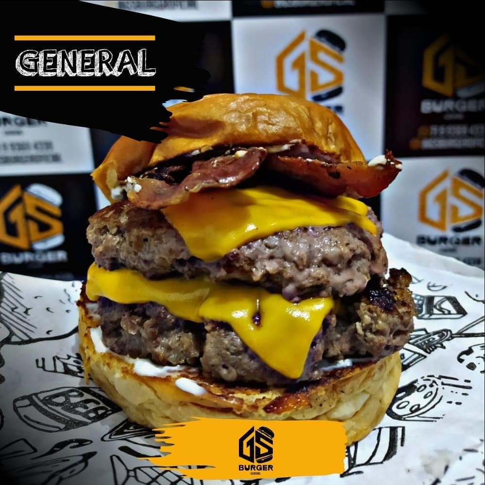 Apresentamos o '3 Generais', nosso prato estrela da semana! Ele é composto por duas suculentas carnes de 100g cada, banhadas com nosso molho Aioli exclusivo e gratinadas com queijo cheddar derretido. Para incrementar ainda mais, adicionamos cebola caramelizada na cerveja preta, trazendo um toque adocicado e complexidade de sabor. bacon crocante adiciona uma textura surpreendente. Tudo isso servido no pão de brioche macio e fresquinho. É um lançamento imperdível e delicioso!