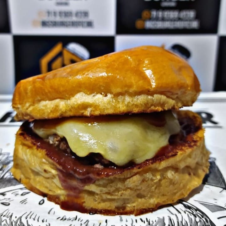 Burger 100 g, molho barbecue especial, queijo Mussarela , servidos no pão brioche.