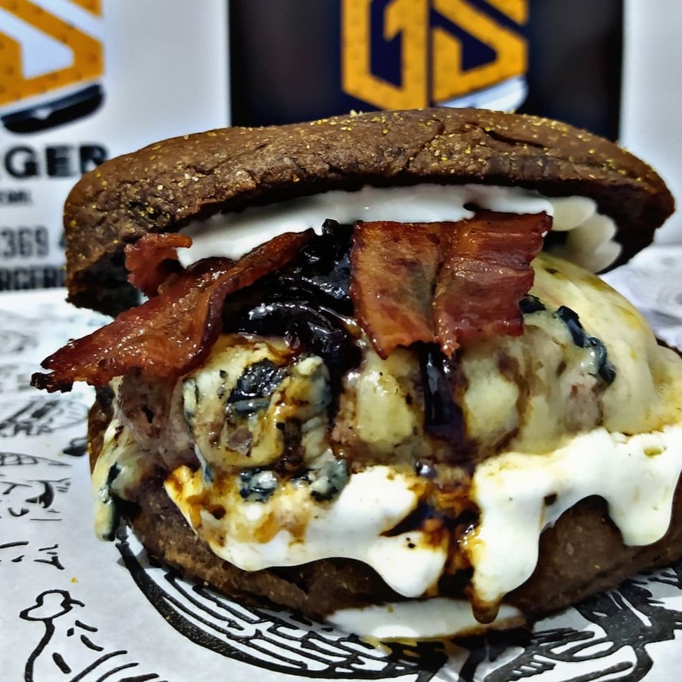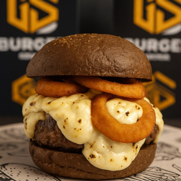 Burger de 140 g, um delicioso molho barbecue artesanal, cebola caramelizada na cerveja preta, Onions , gorgonzola + coalho maçaricado no pão australiano