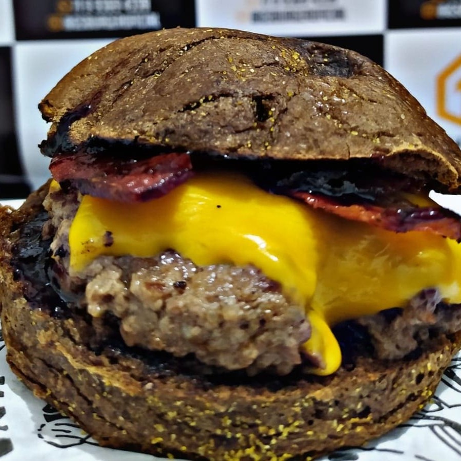 Burger de 140g, molho barbecue especial, queijo cheddar, cebola caramelizada na cerveja preta ,Farofa de Bacon, servidos no pão australiano da casa .