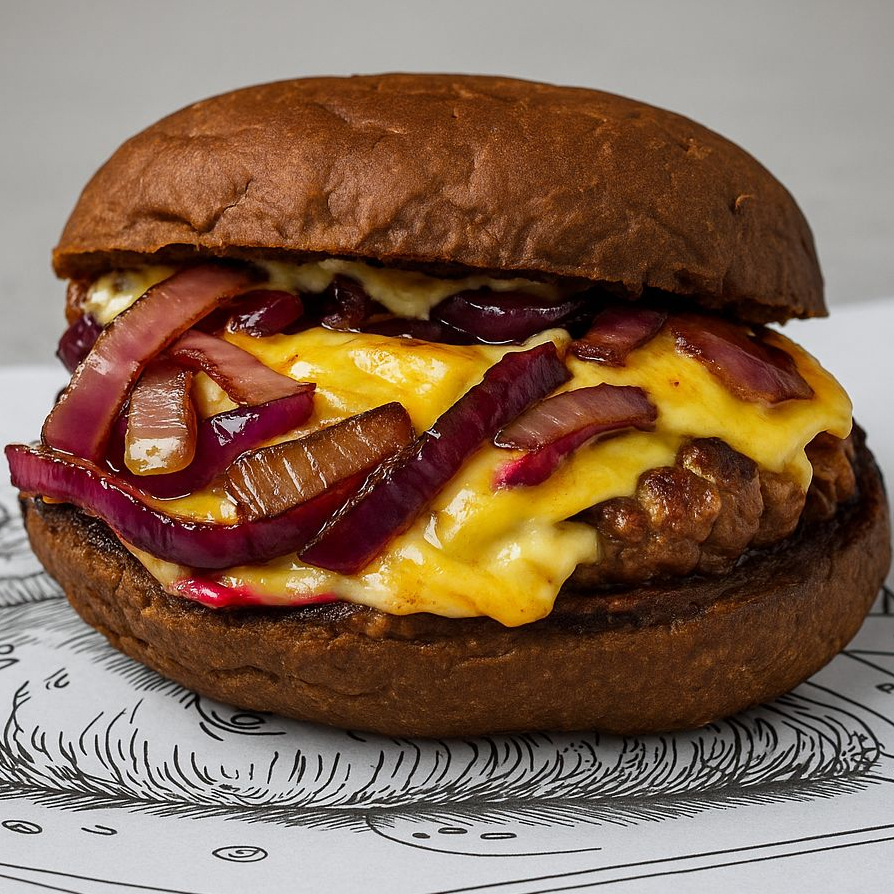 Burger de 140g, queijo gouda, cebola roxa salteada na manteiga, Catupiry Gratinado , servidos no pão australiano.