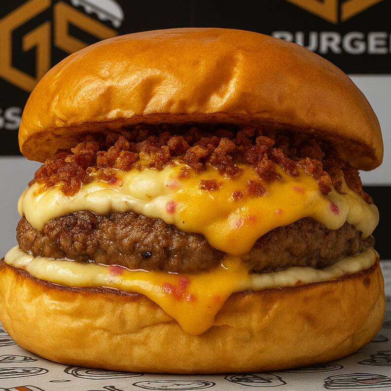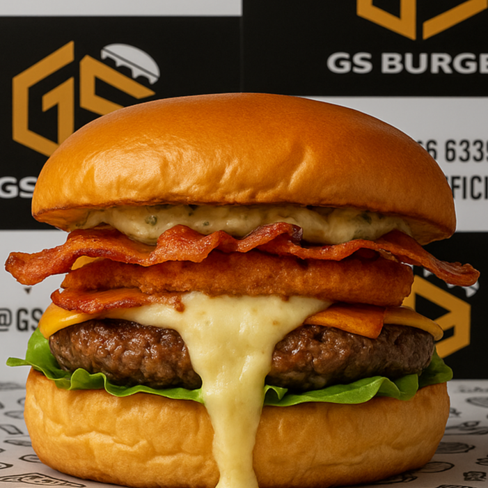 Esse burger é puro impacto: pão brioche levemente tostado, um suculento blend de 100g, coberto por um disco de queijo mussarela derretido e envolvente. O bacon crocante traz a textura perfeita, enquanto a maionese de ervas artesanal e alface americana fresca finalizam com um toque de personalidade e frescor. Uma combinação ousada e irresistível!