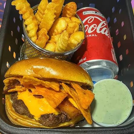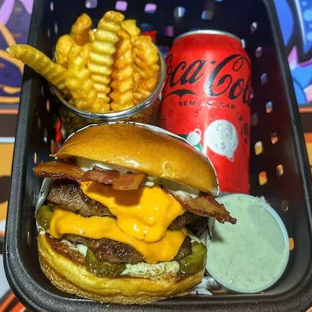 Pão brioche macio , 2 burgers artesanais (120gr cada ), queijo cheddar, fatias de bacon super crocante, cheddar cremoso, picles, e maionese especial da casa( verde) + Batata frita ( aprox 100g) + refri 350ml