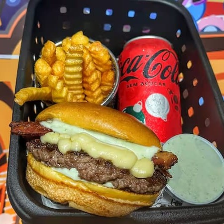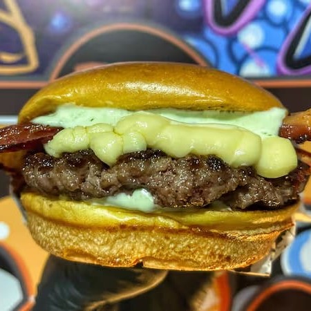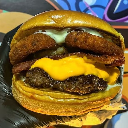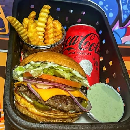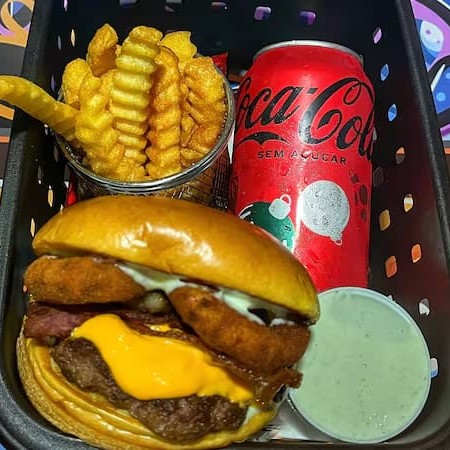 Pão brioche macio, hambúrguer de (150g) feito na grelha com cheddar cremoso, fatias de bacon crocante, anéis de cebola empanados e a exclusiva maionese especial da casa. Uma combinação intensa e cheia de personalidade — o equilíbrio perfeito entre sabor defumado, cremosidade e crocância.