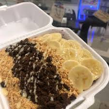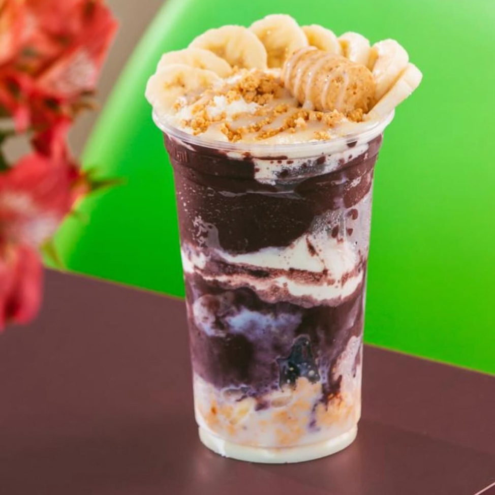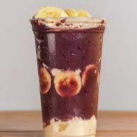 açai mesclado com leitinho coberto com paçoca , cookies, banana e leite condensado