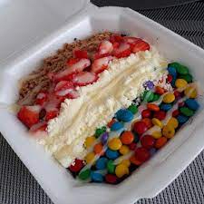 açai mesclado com leitinho coberto com confete , leite em pó, morango , ovomaltine e leite condensado .