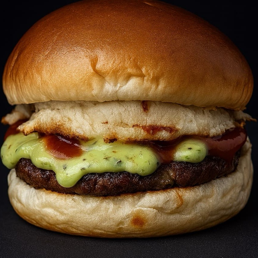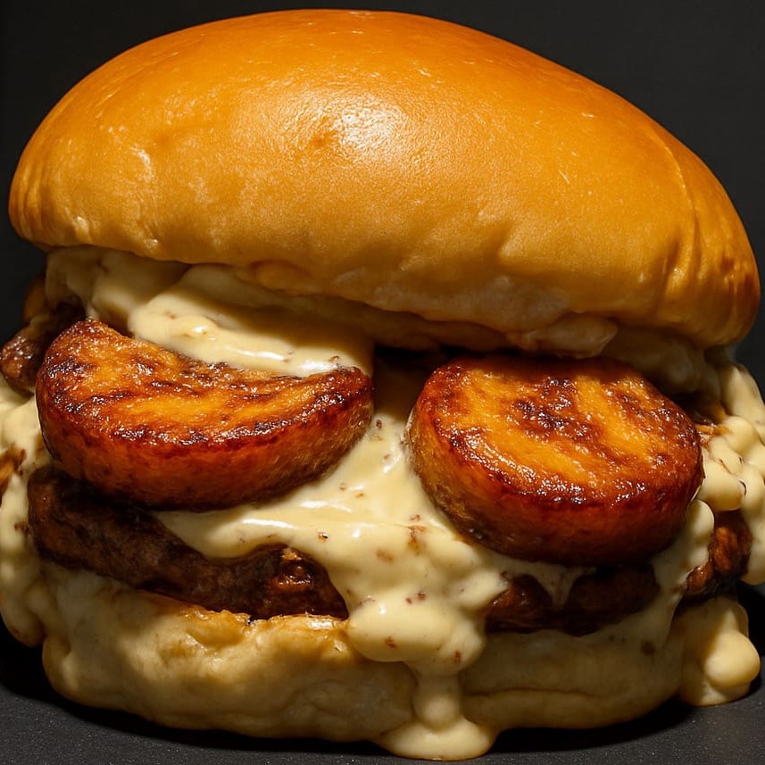 Pão brioche, carne 140g, mussarela, maionese picante, crispy, bananada terra.