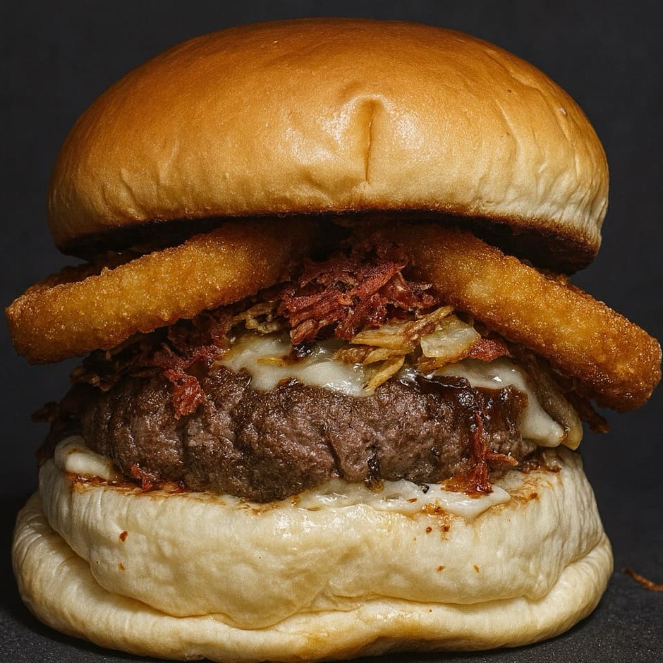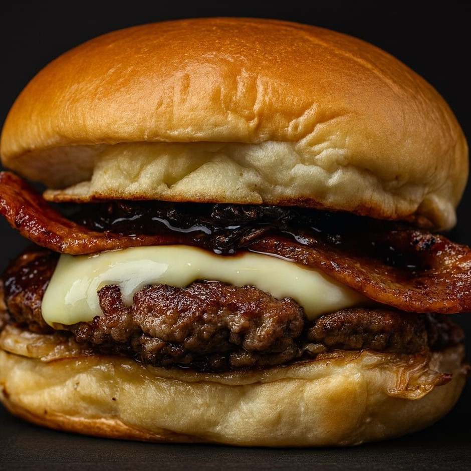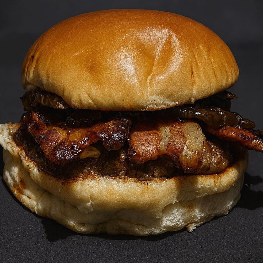 Pão brioche, carne 140g, mussarela, bacon fatia, cebola caramelizada, melt.