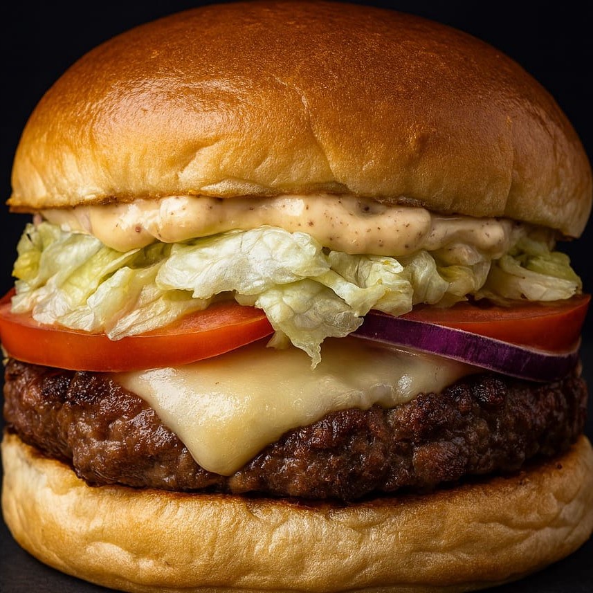 Pão brioche, carne 140g, mussarela, maionese picante, tomate, cebola, alface americano.