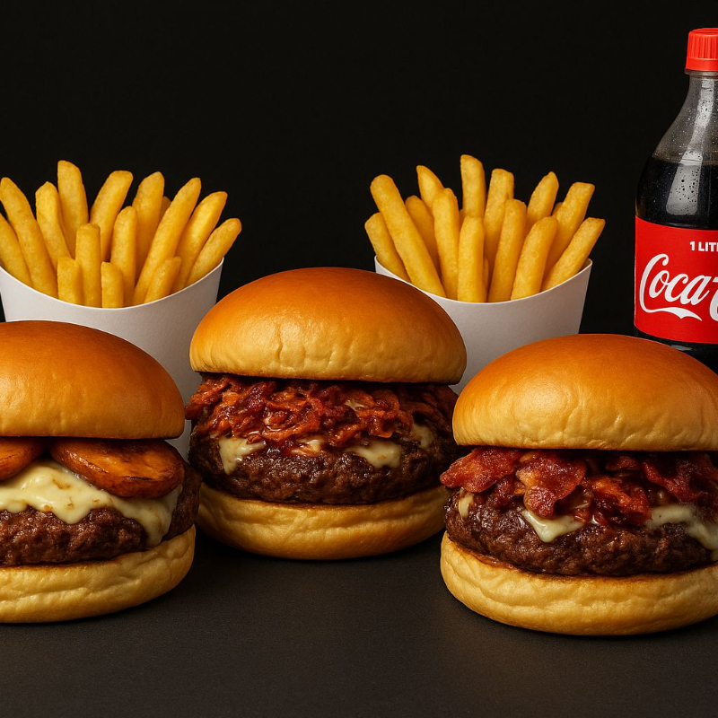 3x Burguer A sua escolha + 3 batatas P 100g + Refri Litro Grátis!