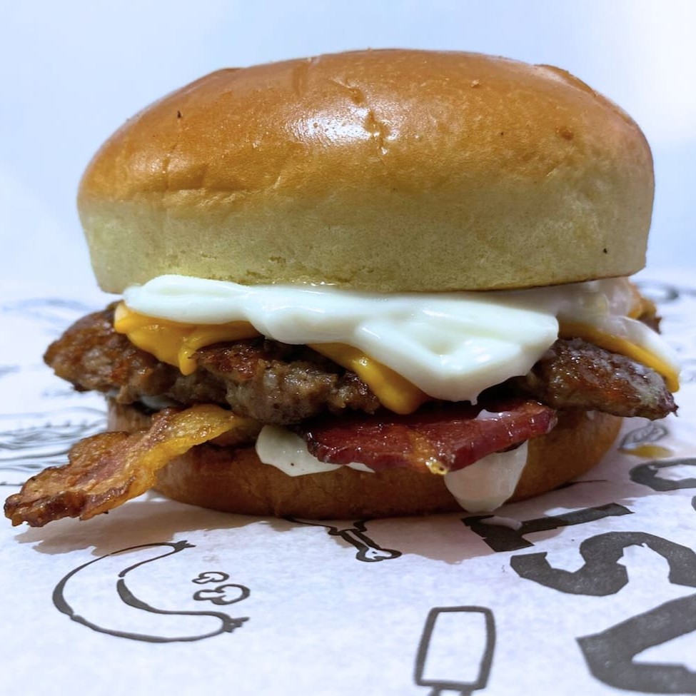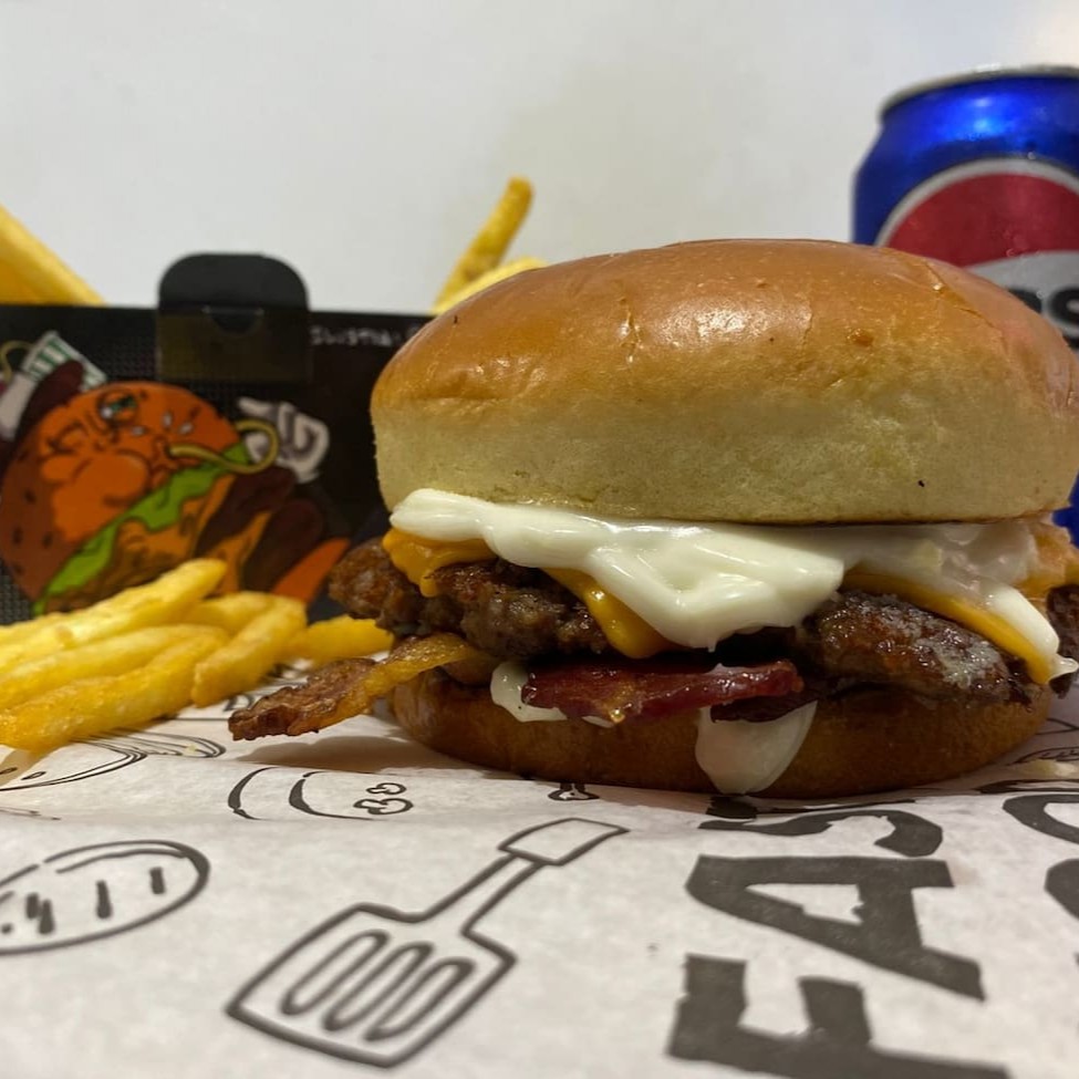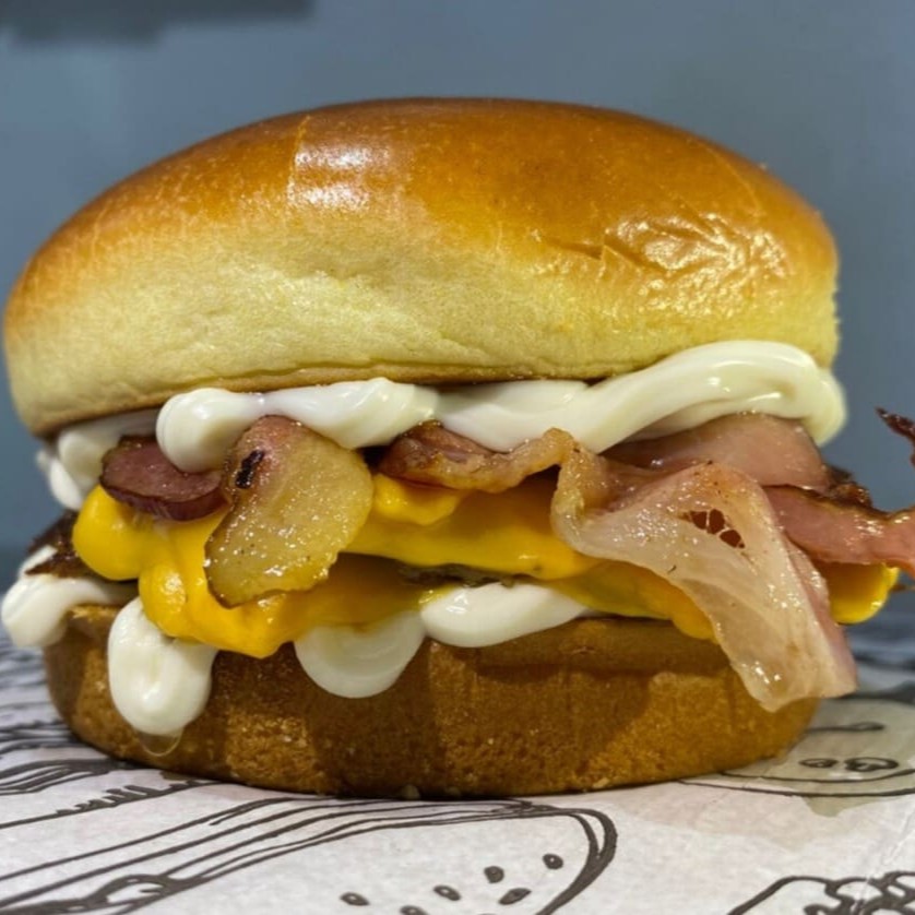Pão Brioche, Carne Smash 60g com nossa crostinha trazendo sabor que combina perfeitamente com nosso queijo derretido, Bacon crocante e para complementar essa delícia, nossa deliciosa Maionese do Chef.