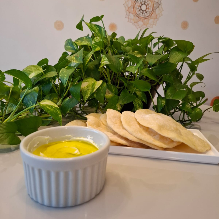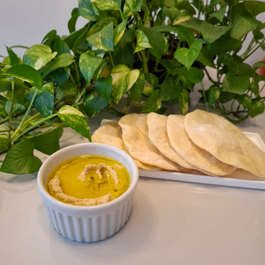 200g de pasta de grão de bico temperada com tahine, limão e especiarias árabes. Acompanha 5 pães sírios. Não contém glúten, exceto pão sírio. Produto Vegano!