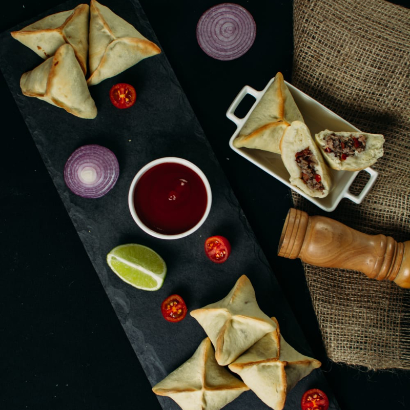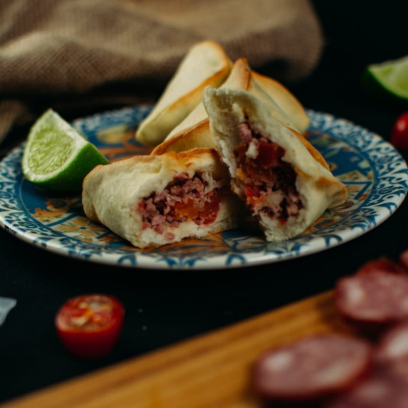 Esfiha Fechada de Cordeiro, autêntica, feita a moda árabe, massa de pão sírio com um delicioso recheio de carne de cordeiro. De tamanho media, cerca de 60g.