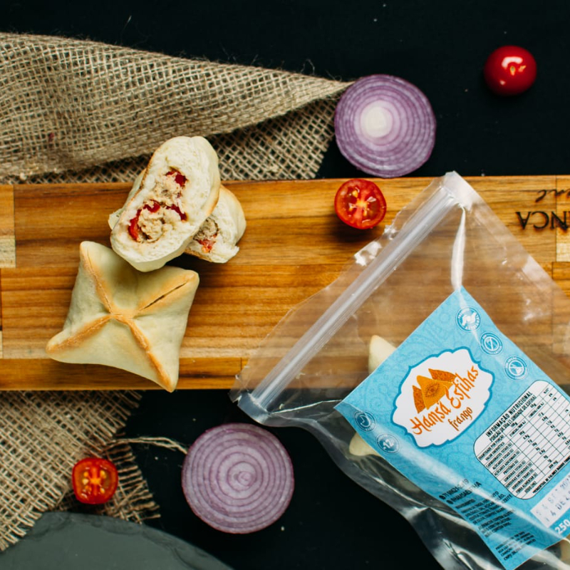 Esfiha Fechada de Calabresa, autêntica, feita a moda árabe, massa de pão sírio com um delicioso recheio de calabresa. De tamanho media, cerca de 60g.
