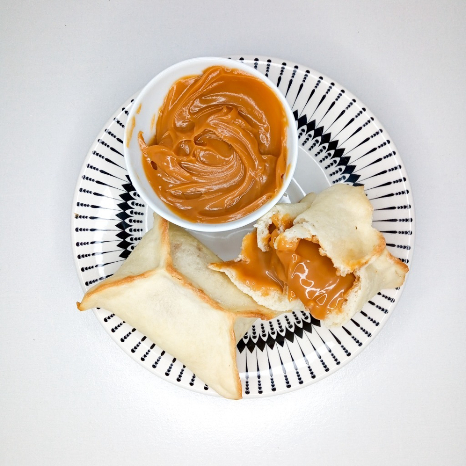 Esfiha Fechada Doce de Leite, autêntica, feita a moda árabe, massa de pão sírio recheada com muito doce de leite premium. De tamanho media, cerca de 60g.