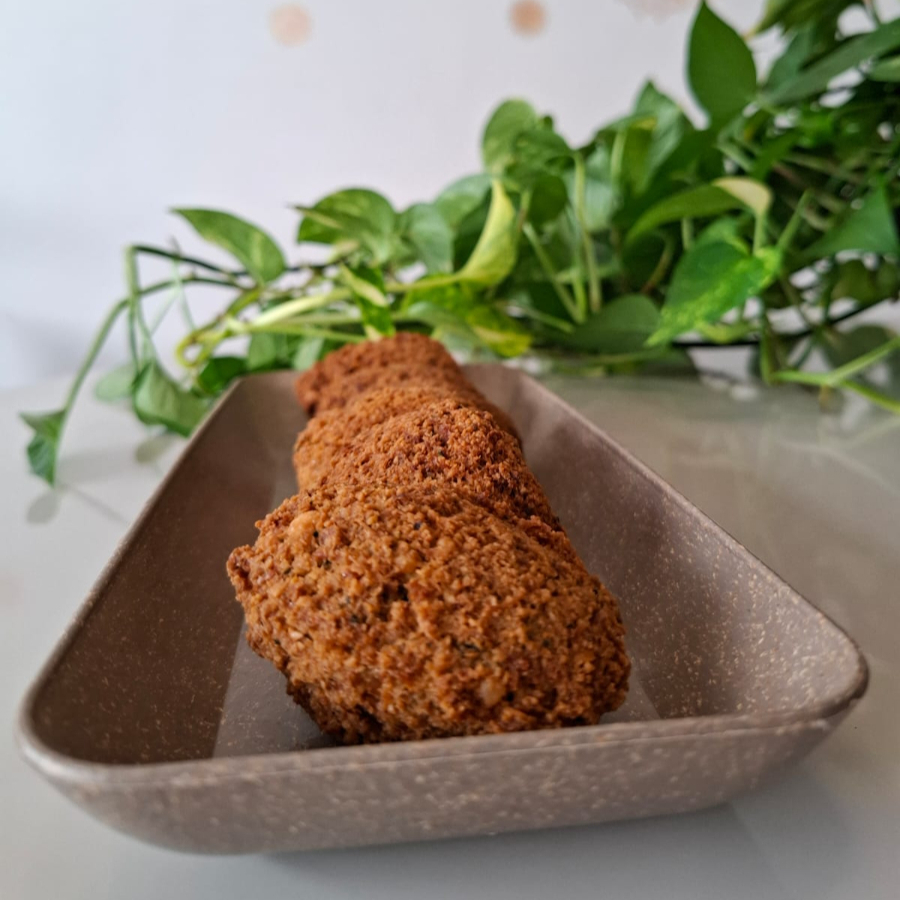 6 falafel. Bolinhos fritos de grão-de-bico temperados com tahine, salsa e especiarias árabes. Produto vegano!